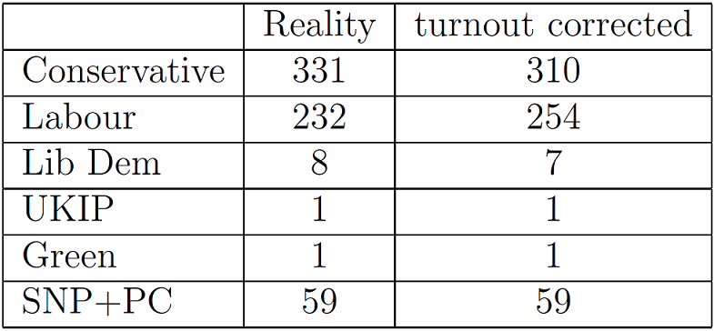 So as we go down to the low N we are really comparing VERY Conservative seats with VERY Labour seats so we should get a cleaner signal. Again this is biased by the fact voter turnout would be lower in safe seats, so the effect could be even bigger than what I am about to estimate. I don’t have a lot of time, so I’ve decided it starts to stabilise around 15% as you reduce N and then below about 50 seats it just gets noisy. Pretty Arbitrary but that’s what I reckon. So I’m going to multiply the Labour vote nationally by 1.15 to estimate what would happen if the Labour Party could get their supporters to turn out and vote like Conservatives. This is what happens:-