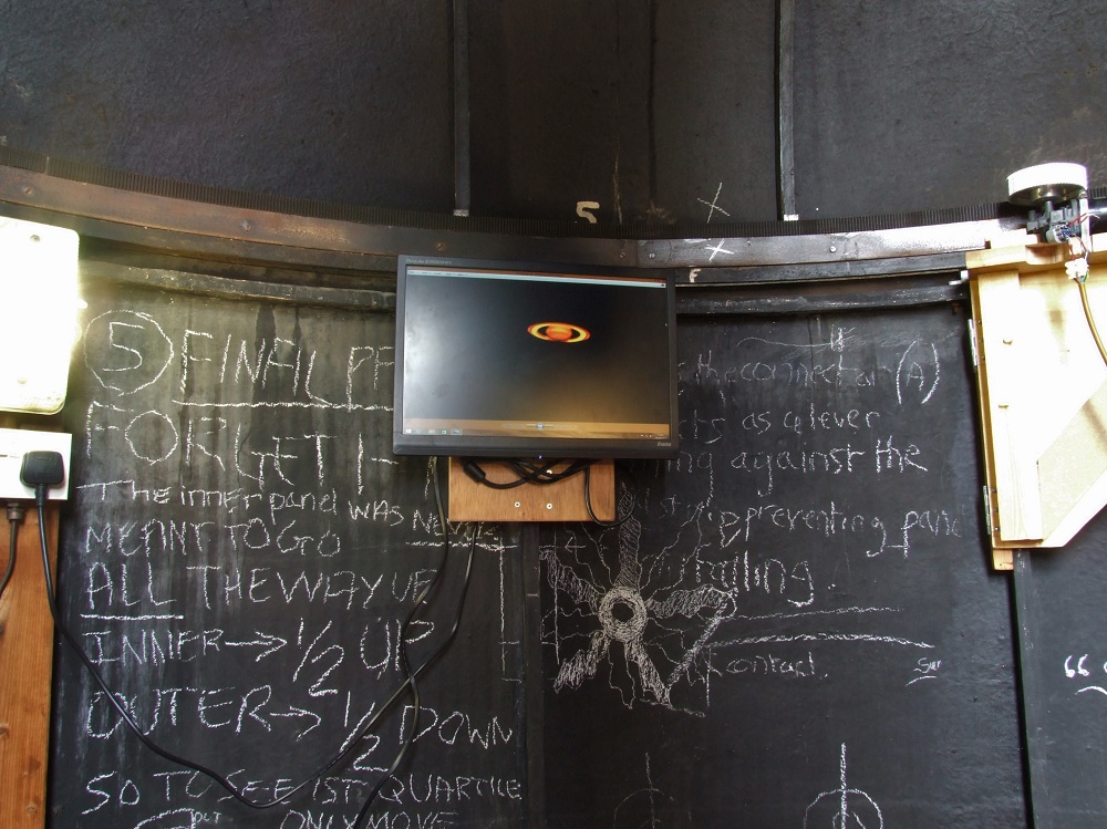 We have been attempting to make the dome rotation smoother and now there an additional monitor has been mounted to the wall inside in the dome so we can have the computer in the hut but still work in the dome (see below).
