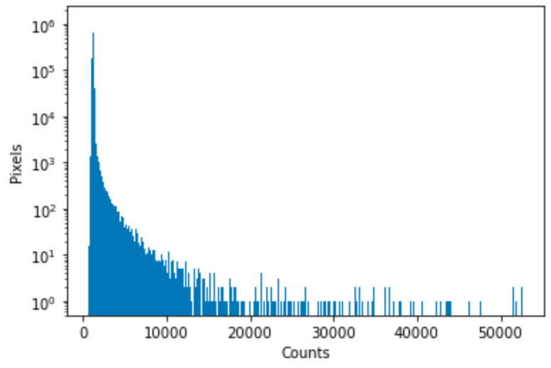 However, this raw image does not only contain the stars; it includes hot pixels captured by the filters and a background. The histogram below shows the numbers of counts vs the pixels of the image above: