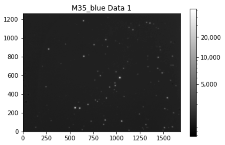The data captured using the telescope at King’s gives us a FITS file, the most common digital file format in astronomy, and were captured with the blue and green filters attached. From that, we were able to open the files and get on with extracting the data. For this post, data from the M35 blue filter will be used. The raw image for M35_blue from Python can be seen: