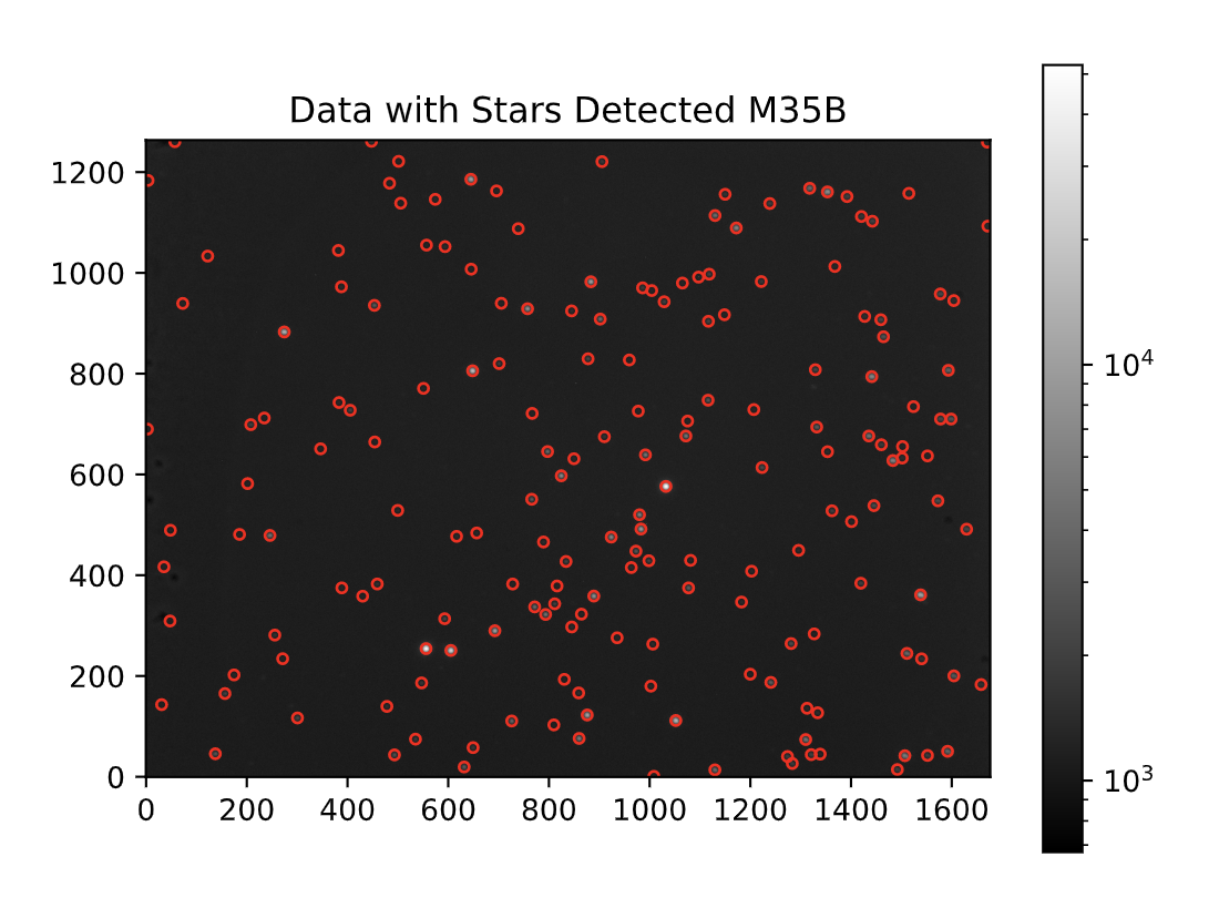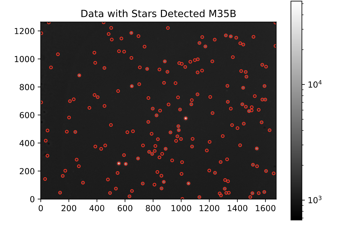 Next, the hot pixels needed to be removed from the image (detailed post here). Below is a picture showing the stars detected on the M35_Blue image after removing hot pixels using a code in Python: