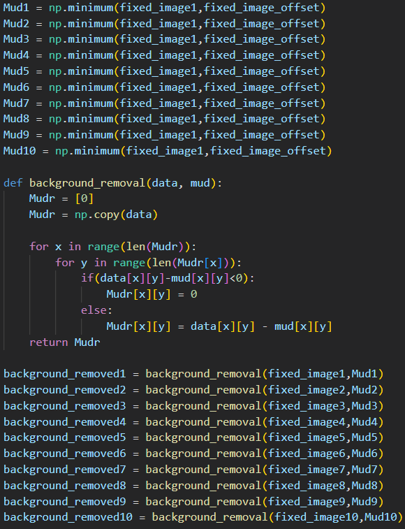 As described, the code generates an image showing the minima between the main images and the offset image, then subtracts this ‘mud’ from the original image to remove the noise pollution. The function backround_removal also needs error handling for underflow errors, as when values go below zero, they wrap back around to the maximum 32 bit integer. This can be avoided by implementing an if statement that checks if any values drop below zero, and returns them to zero.